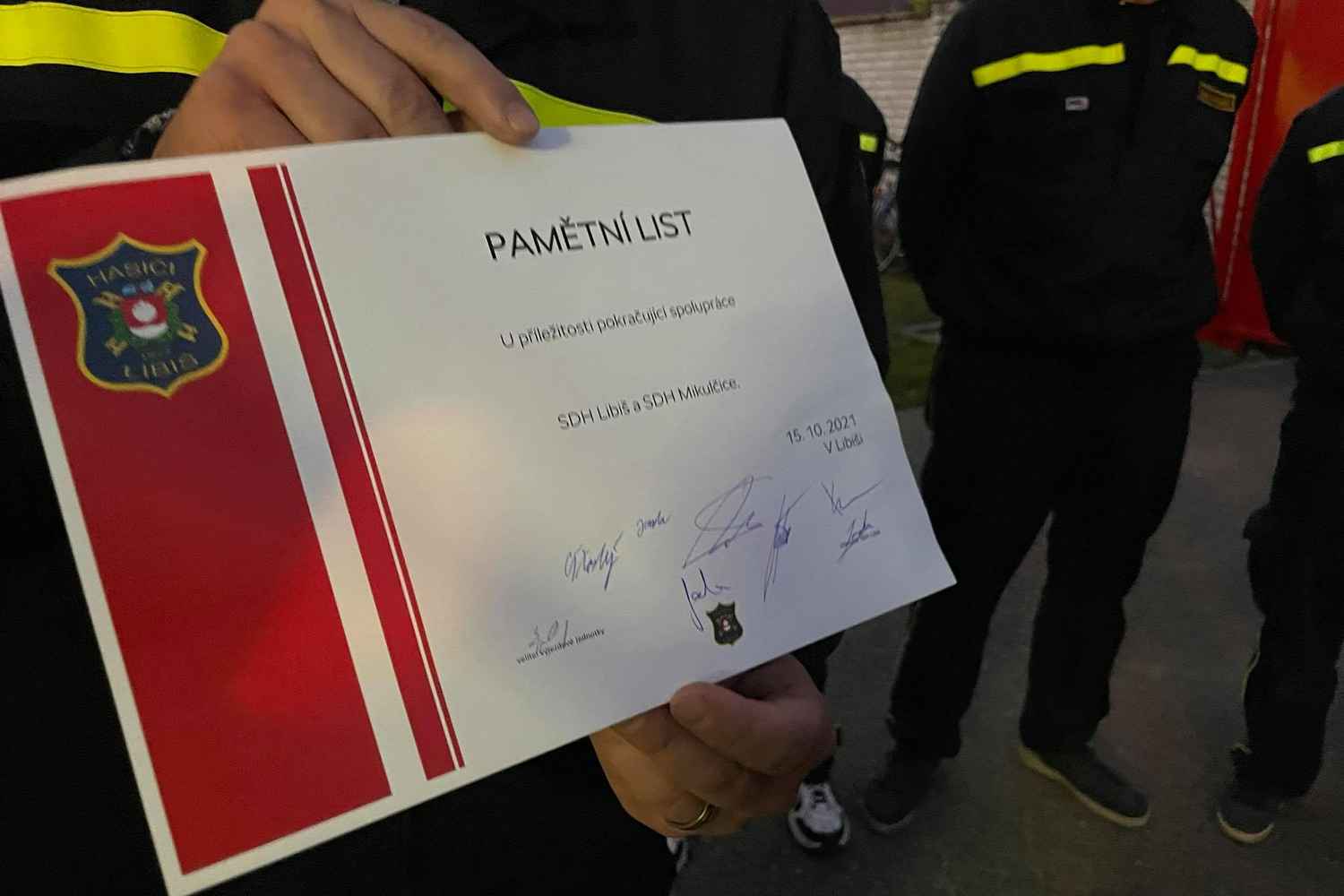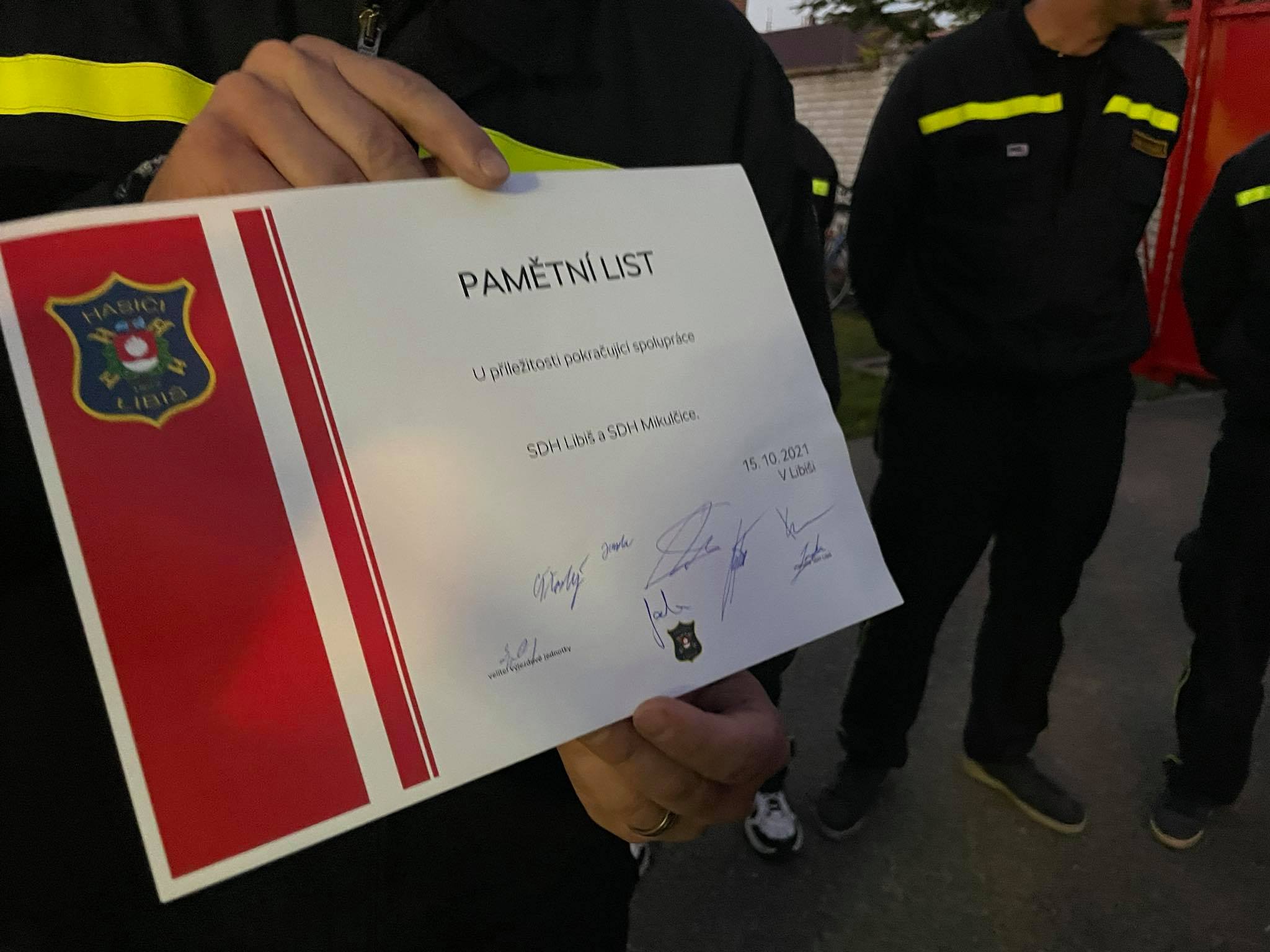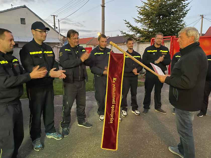 Naše výjezdová jednotka se vrátila na víkend do Mikulčič, do obce kde pomáhala s odstraňováním škod, napáchané tornádem. Tentokrát to však nebyla pracovní návštěva, ale návštěva slavnostní. Jakub Janda předal svému protějšku Jaroslavovi Bolfíkovi pamětní stuhu na prapor Ku příležitosti spolupráce s místním SHD. Naši kolegové plánují navštívit náš hasičský bál. Moc se těšíme až je opět uvidíme